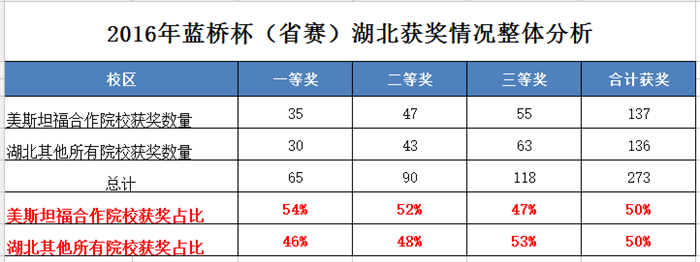 此次“蓝桥杯”大赛,美斯坦福合作院校中共有15所合作院校参加,其中湖北省合作院校13所,湖南省2所,总参赛人数为354人,获奖人数273人,获奖率77.12%,湖北省合作院校获奖人数占湖北省总获奖人数的50%,创下历史新高。此外,首次参加蓝桥杯的湖南省的两所合作院校共建专业也取得了优异的成绩,其中湖南工程职业技术学院获得一等奖1名、二等奖1名、三等奖10名,湖南安全技术职业学院获得二等奖1名、三等奖6名。