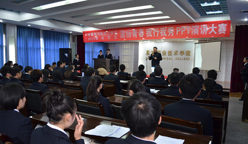 2013月12月11日,恩施职业技术学院计算机与信息工程系以“激扬青春,我行我秀”为主题举办的“我的大学之初印象” PPT演讲大赛于校行政大楼启动。由韩国丽、唐传凯两位同学主持这场大赛。计算机系段昌盛主任、王晓书记、罗兴荣教授等10多位领导作为嘉宾和评委出席现场并对参赛选手进行打分点评。