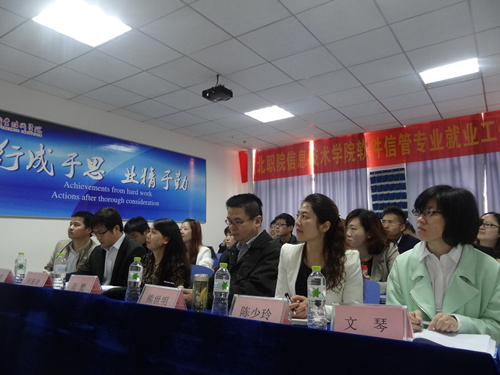 接着,就业部刘莲莲老师向全体参会老师陈述了学生目前就业工作的主导方向,着重强调了“订单班”的重要性与必要性,这使软件信管专业的老师对于学生的就业安置有了更加充分的了解。同时软件信管专业周樊主任结合目前信息技术的严峻就业形式,指出了当前我们广大学生应根据自身特点,积极转变就业观念,认清就业形势,并强调此次就业核心出口为首都“北京”。负责北京就业的刘建弟老师也为所有参会老师陈述了北京的就业优势,从各方面细致的讲述了哪些学生适合在北京就业,适合在北京安家。