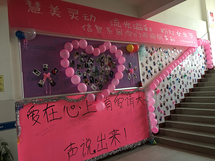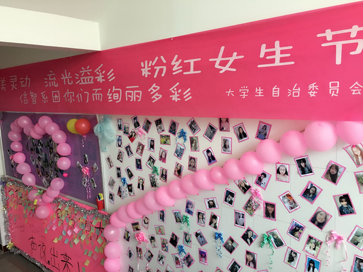 在信智系教学楼内,大学生自治委员会的同学精心制作了由系部女老师和女同学照片汇集而成的照片墙。精致的气球、漂亮的彩带都给现场营造了一种浪漫、温馨、和谐的氛围。墙上镶嵌着的气球由“心”状组成,意为心心相印,下面的签名墙,写满了各班同学对老师们的最真诚的祝福。这面特别的照片墙也吸引了不少其它系部同学的驻足,这种温馨、浪漫的氛围感染了现场的每一个人。