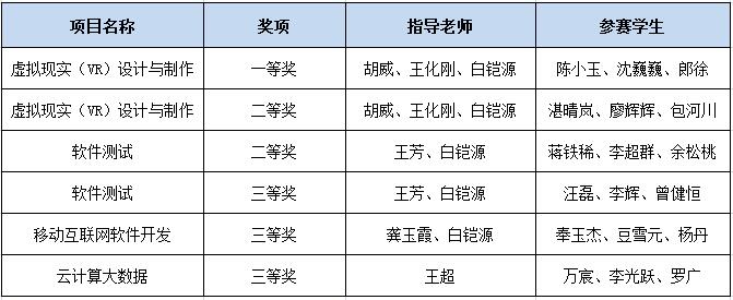 其中胡威、王化刚、白铠源老师带领的陈小玉、沈巍巍、郎徐参加的“虚拟现实(VR)设计与制作”项目,王芳、白铠源老师带领的蒋铁稀、李超群、余松桃参加的“软件测试”项目顺利晋级全国总决赛。