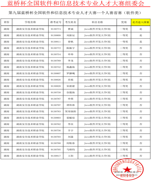 4月9日,由教育部高等学校计算机科学与技术教学指导委员会、工业和信息化部人才交流中心共同主办举办的第九届“蓝桥杯”全国软件专业人才设计与创业大赛选拔赛获奖名单已经揭晓,在此次比赛中,湖南安院机电信息学院的学子们取得优异的成绩。机电信息学院软件专业共33名学生参加JAVA软件开发大学C组赛事,其中,曹斌、刘新辰、曾帆3位同学荣获大赛一等奖;宋甜甜、李龙、申帅等8名同学荣获大赛二等奖;王阳、羊宇、何贻春等12名同学荣获三等奖。获得一等奖的3名同学将代表机电信息学院到北京参加全国总决赛。